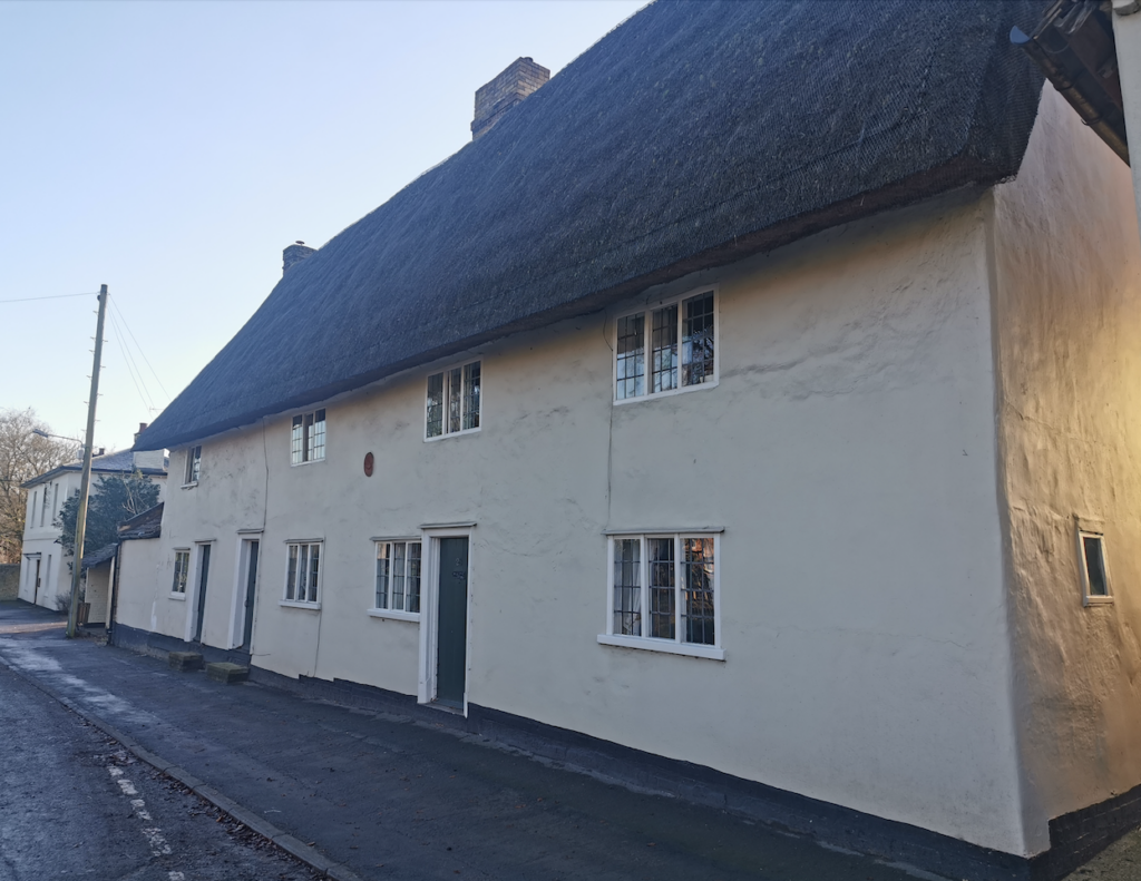 Row of cottages, possibly originally a single dwelling. C17 timber-framed and plastered with tarred and plastered brick plinth.