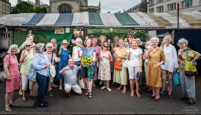 Harvey & Son have been selling their homegrown bedding plants, vegetable plants, salad, fruits and vegetables on Cambridge Market since 1930 but after 92 years they are giving up their stall and closing their nursery at Little Shelford. Today Joanna Harvey, third generation market trader (centre) received a surprise visit from well-wishing customers. And so another little bit of old Cambridge is lost.