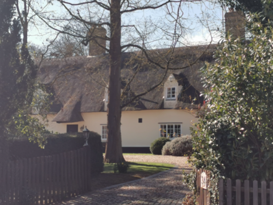Row of four cottages, now one. C18. Clay bat, rendered in brick plinth and long straw thatch. Two shared red brick stacks C18, with upper courses rebuilt in early C19 in grey brick.
