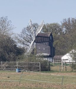 Post Mill. Timber-framed, weatherboarded on brick plinth. Boat cap and four patent sails. Removed from Ellington, Huntingdonshire in 1936. Inscription inside the Mill “Walter Ambrose Harding of Madingley Hall caused this Windmill to be brought from Ellington in Huntingdonshire and to be rebuilt here on the site of the old mill which fell down in July 1909. Mr C J Ison, builder of Histon finished it the 1st June 1936”.