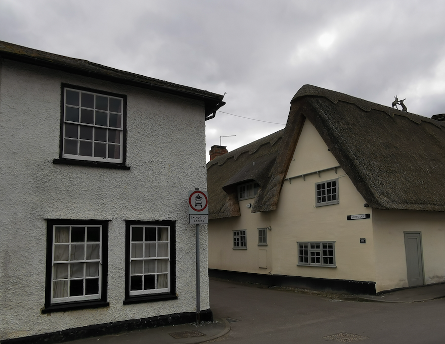 Row of cottages C18 or C19, with mid-late C20 restoration and enlargement at rear to No. 101. Timber framed, rendered with long straw thatch roof and shared stack of two linked shafts diagonally set.