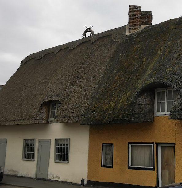 Row of cottages C18 or C19, with mid-late C20 restoration and enlargement at rear to No. 101. Timber framed, rendered with long straw thatch roof and shared stack of two linked shafts diagonally set.