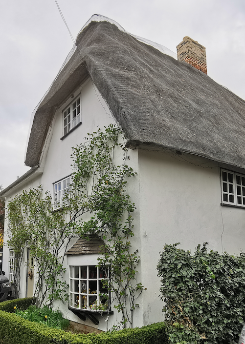 Two cottages, originally one dwelling. c.1700 renovated and restored mid-late C20. Timber-framed, rendered and long straw thatch, half hipped roof.
