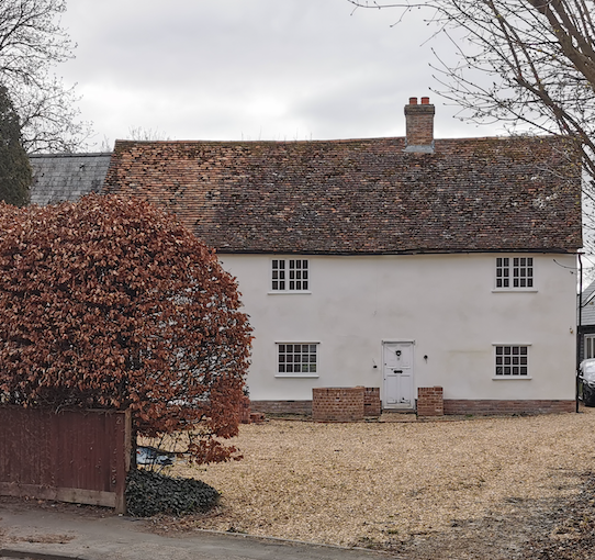 Probably early C18 restored c.1984. Timber framed, plaster rendered and steeply pitched tiled roof with rebuilt ridge stack.