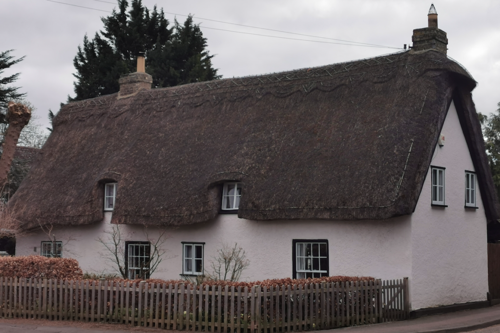 Cottage. Late C18. Timber framed, roughcast rendered and long straw thatch gabled roof. C19 grey brick stacks to ridge and end.