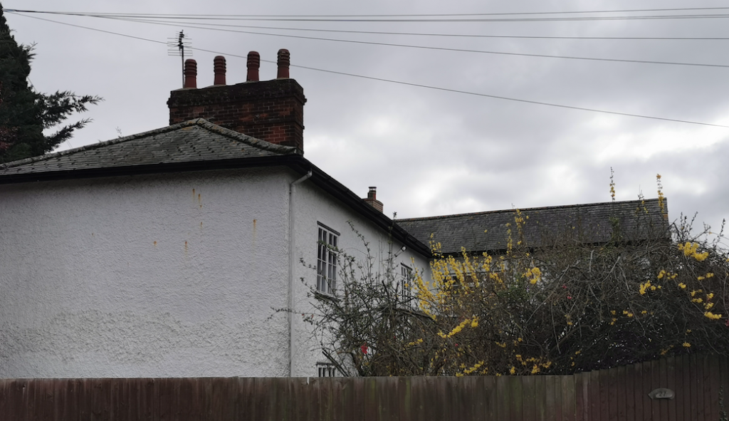House. C18 origin, remodelled and roof raised early C19. Altered and extended mid-late C20. Timber framed, plaster rendered and low pitch slate roofs, hipped, with early C18 red brick stack at right angles to ridge.