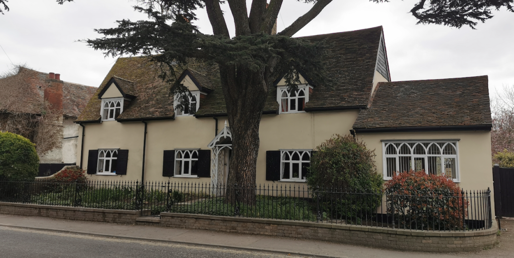 Late C17. Timber framed, rendered and steeply pitched roof, originally thatched. Two C19 grey brick ridge stacks.
