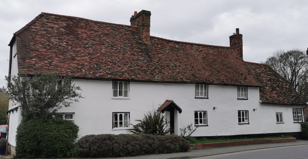 Two main building periods. C18, extended by one bay later C18. Timber framed, plaster rendered on plinth, cement rendered.