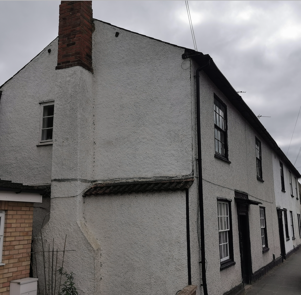 Row of three houses. Early C18 in origin but roof raised and first floor added early C19. Parallel range added at rear also early C19. Timber frame roughcast rendered and low pitch, slate roof hipped at corner. Red brick stack at right angles to the ridge. Early C18 cottage of lobby entry plan and probably three bays. Subdivided and extended early C19 so that return now to Meeting Lane.