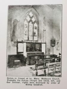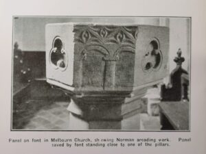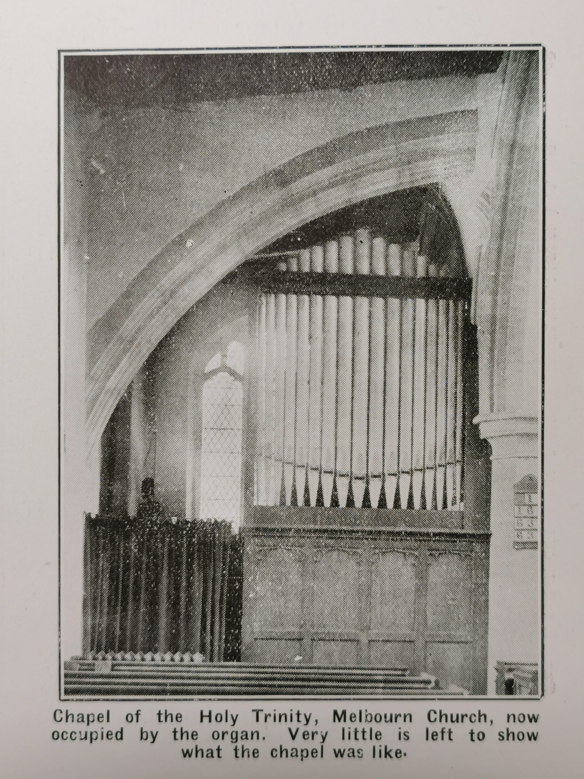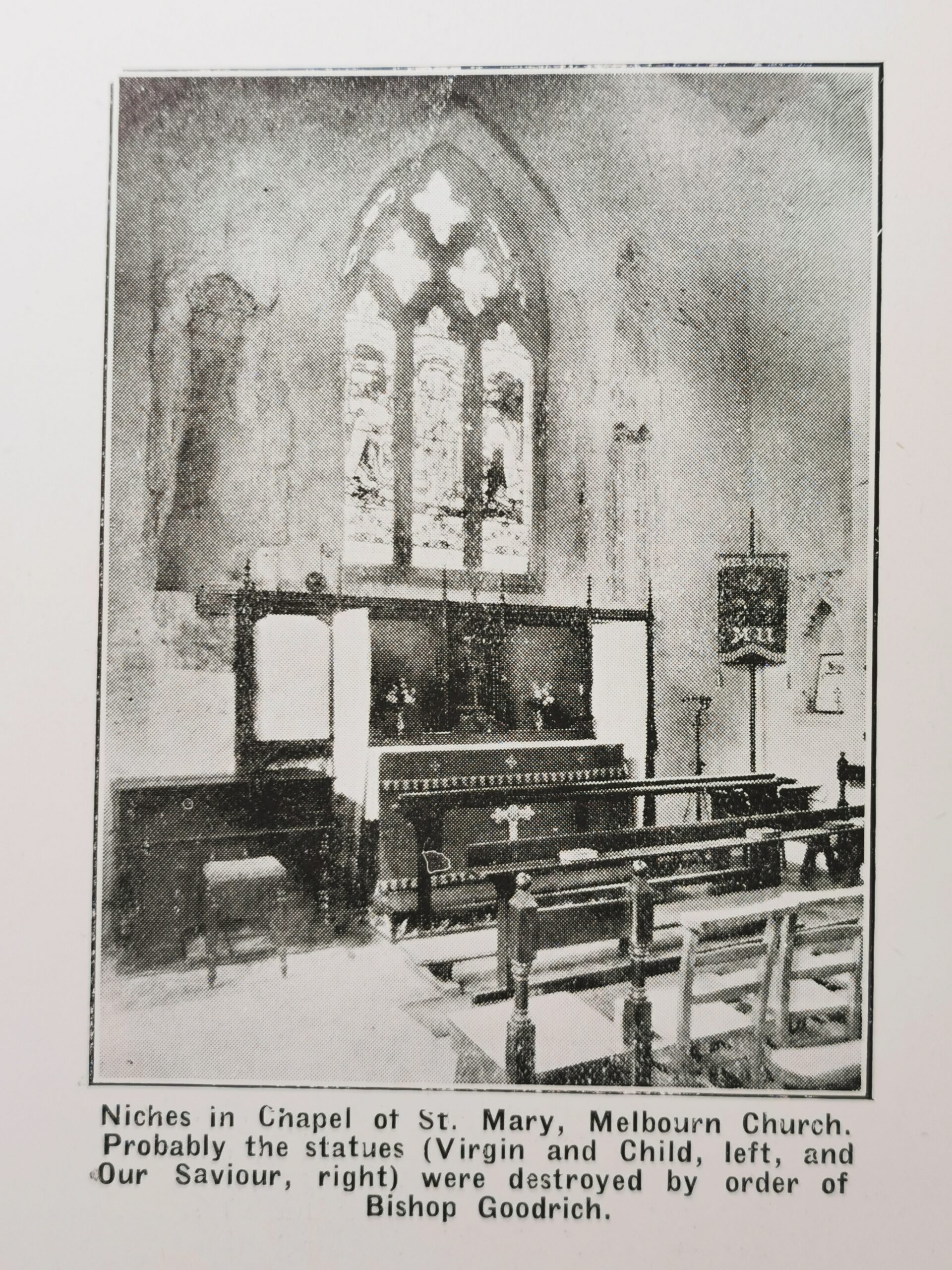 Transept Window All Saints Melbourn in memory of Henry Brodie DayParish Church. C13 chancel, nave and part of West Tower. Much altered in C15 when West tower was almost completely rebuilt, clerestorey added and chancel roof raised. Major restoration of 1882-3 by R.R. Rowe. Plan of West Tower, nave and aisles, South porch, Chancel and North Vestry. West tower mostly C15 although the tower arch is C13.