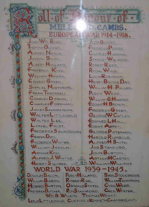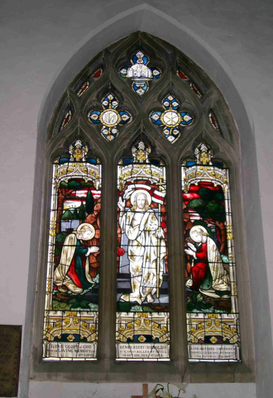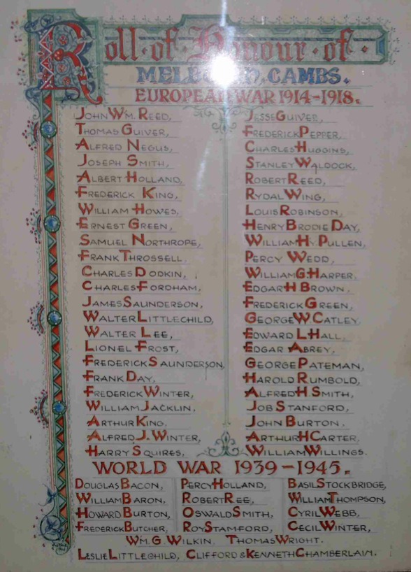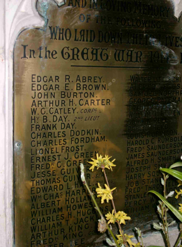 The large window in the transept is in memory of Henry Brodie “Harry” Day, b 5.3.1897 Royston d. 3.2.1918 from shellfire on Western front. Harry was also an assistant schoolmaster in the village until the First World War when he enlisted in December 1915 at the age of 18 and joined the Suffolk Regiment. He served as Private and Lance Corporal in France with the Suffolks during 1915 and 1916. He then joined the Officer Training Corps at Newmarket in July 1917. He was required to present a certificate of moral character; this was signed by the Rev. De Courcy Ireland of Melbourn and Mr A R Fordham JP. Harry was then commissioned as a second lieutenant on 30th October 1917 and joined the C Company, 1st Battalion, 1st Cambridgeshire Regiment on 3rd January 1918. Exactly one month later, to the day, he was killed by shellfire, apparently behind the lines, together with his batman. He is buried in Grave IV.A.22., Fins New British Cemetery, Sorel le Grand, Peronne.