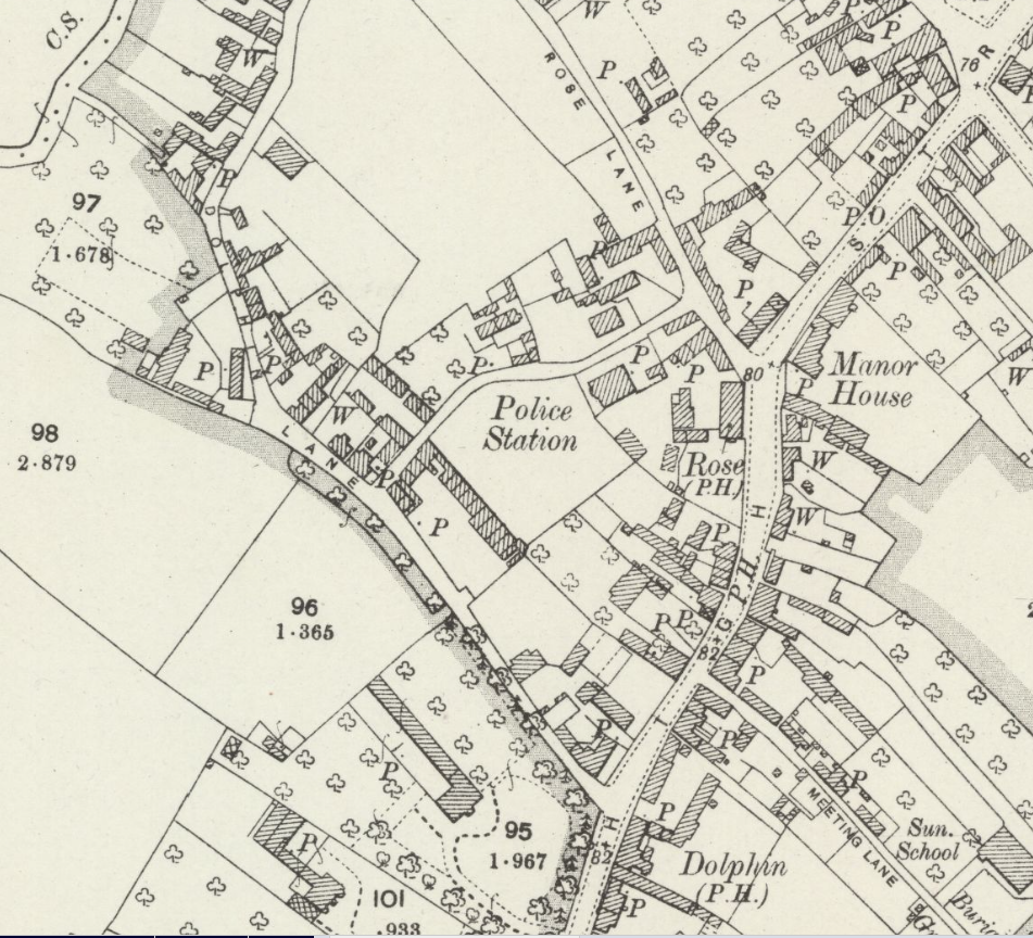 The scene of the fire was Rose Lane, Police Station Lane and Dolphin Lane, in the centre of the village. Along these lanes clustered a number of old fashioned thatched cottages, barns and outbuildings, most of them built of ‘clay bats’, large oblong blocks of sun dried clay mixed with straw, with here and there a brick and tiled building.