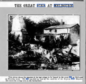 The village of Melbourn was visited yesterday afternoon with the most disastrous fire ever known in the locality, by which 13 cottages, several barns and between 20 and 30 outbuildings were totally destroyed and eight families rendered homeless. Fortunately the fire occurred in the daytime, and aid was quickly forthcoming or the results might have been even more disastrous, as one eye witness described it, ‘it travelled as fast as a man could walk.’