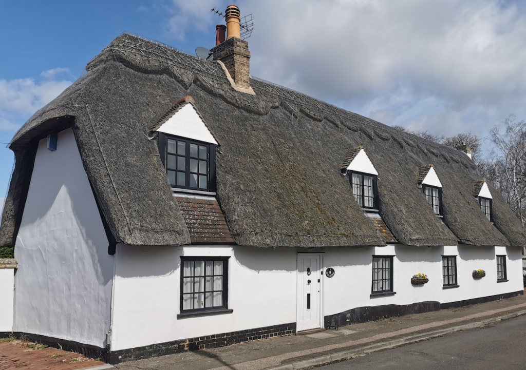 Cottage. C17, C20 extension of two bays to north east. Timber framed and plastered, painted brick, long straw, half-hipped thatched roof.