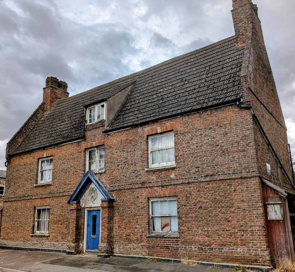 This was the Post Office in 1899; the doorway and porch are Jacobean. The heraldic Scots Thistle above the door may be connected with prisoners from the Battle of Dunbar (1650) who were brought to assist in the Fen Drainage. The original thatched house is now a builders yard. (A Walk Round The Village Of Over,E G Papworth)