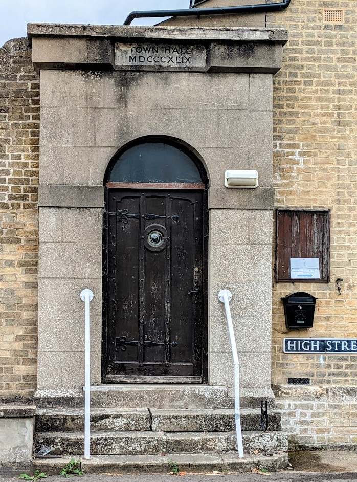 Town Hall, Over (RGL2025)1849 inscription. May have been built on site of older Court House or Guild Hall. Previous Guild Hall was so neglected it fell down and killed “a woman named Mistress Day.” Note three corner pinnacles.