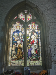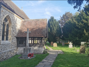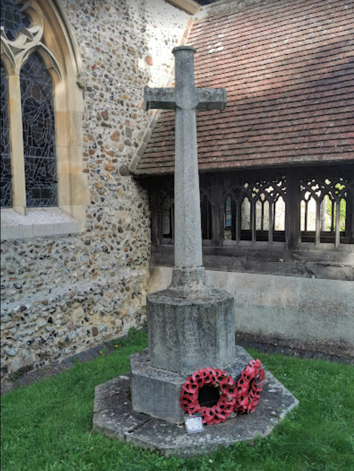 War memorial. c.1920. Designed by R Blomfield (1856-1942). Limestone. Octagonal sectioned cross standing on stepped plinth with names of war dead of two world wars inscribed on plinth.