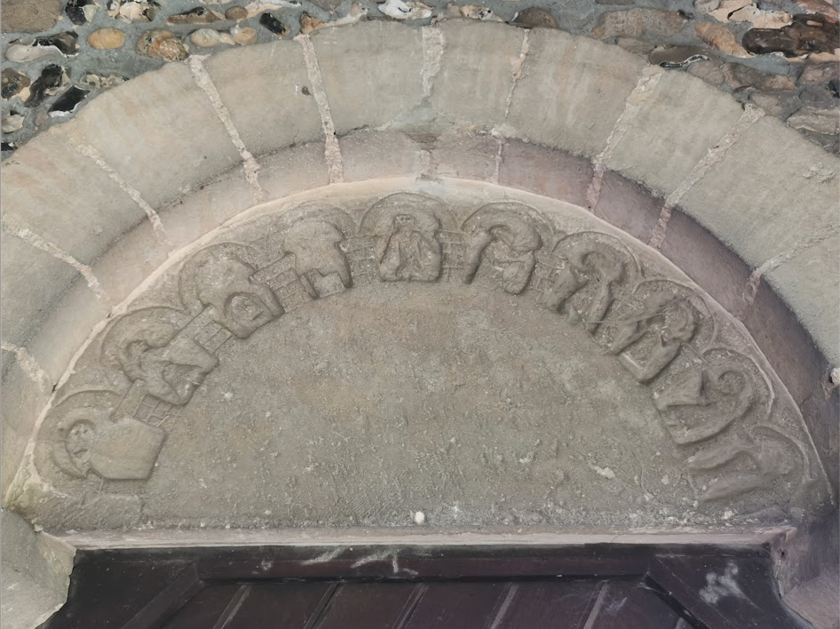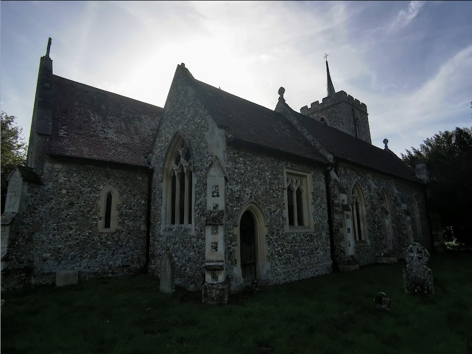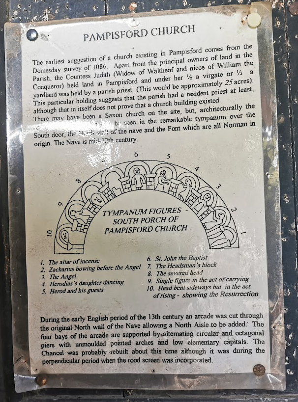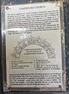 St John the Baptist, PampisfordParish church. C12 nave, south doorway with noteworthy carved tympanum, north arcade inserted c.1200. Chancel early C13, west tower c.1330 added to shortened nave; wide tower arch in anticipation of a larger tower. Chancel arch rebuilt and north aisle widened C15. Restorations in 1850, and 1856 by P.C. Hardwick (1822-90) when the south porch was added; 1876-91, and 1893-7 by Sir Arthur Blomfield (1829-99), vestry and organ chamber.