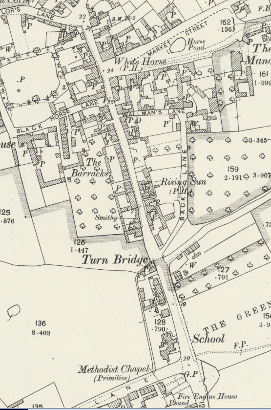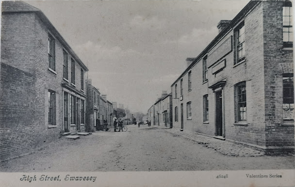 High Street c.1900, (L) general stores of Harry Williams, Post Office with queue, Sir Harry Smith pub which became Post Office, (R) Black Horse public house, bake house of Mr George Key taken over by son Henry until it closed c.1947, Mr Walter Spalton’s butchers closed in 1970s. (Alan Lee Swavesey collection)