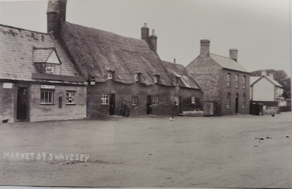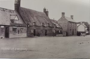 Market Street Swavesey from main road 1930. Post Office (l) with Mr Lee at the door. Post Office was originally blacksmiths. Mr Lee retired in 1949. (Alan Lee Swavesey collection)