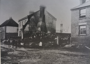 Church End, Swavesey. On left St Fabians (white house) and Swan with Two Necks pub. On right, two thatched cottages destroyed and only chimney left (Alan Lee Swavesey collection)