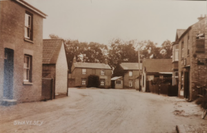 Church End, High Street end, Mr Wilson grocers on far right; also on right next to flag pole, Mr Parrish, shoe repairer, Mr Bond shoe repairer in wooden hut straight ahead (Alan Lee Swavesey collection)