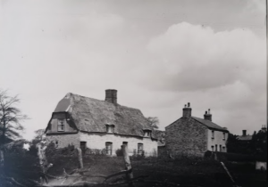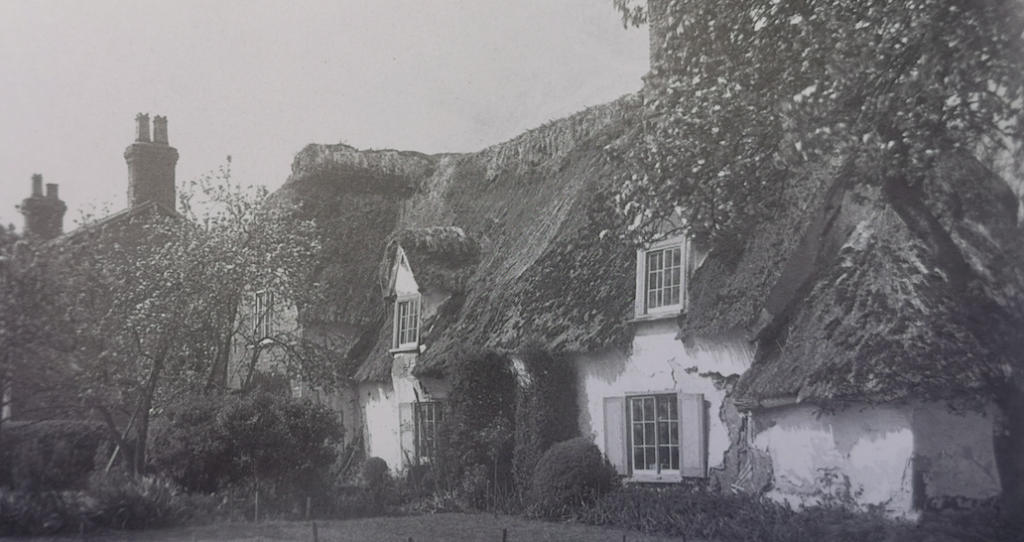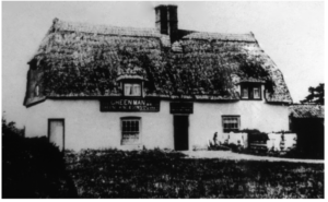 The thatched Green Man, Boxworth End, was another public house built on the edge of the Great Green after the road across the green was created at Inclosure. It stood about 25 yds back from the edge of the road. In 1909 it was closed as a licensed public house and sold. It was purchased by Mr William Daisley and made into two cottages. After the photograph was taken the thatch got into a bad state. Mr Daisley decided to case the walls of the house with bricks and a wooden frame clad with corrugated asbestos was built over the thatched roof.Shortly after the war a Mr Cherry purchased the property. He installed an Aga cooker and used empty 5 gallon oil drums to make the flue. By 1960 these had rotted away and exposed the thatch which ignited and the roof was destroyed. He then re-roofed the house at a lower pitch and continued living there. (From Cambridgeshire Community Archive Network)