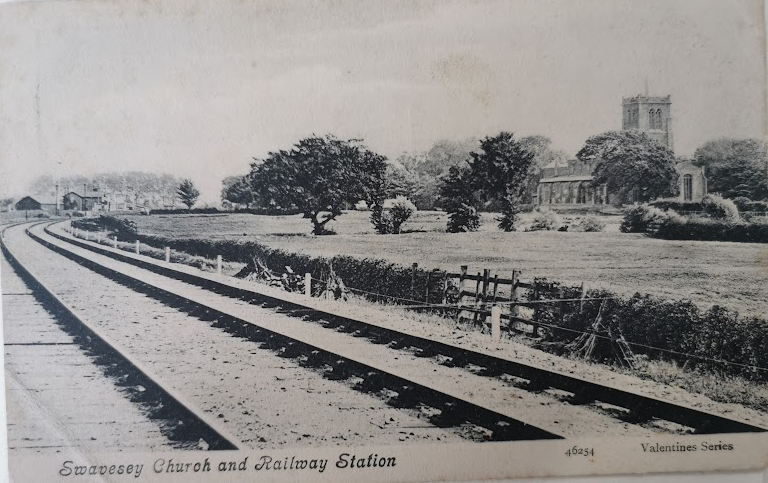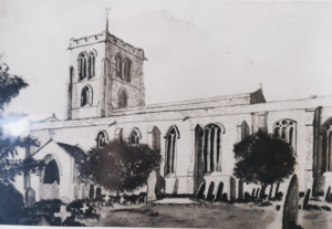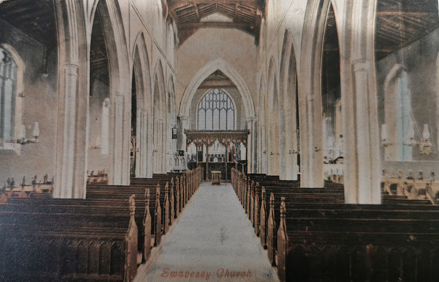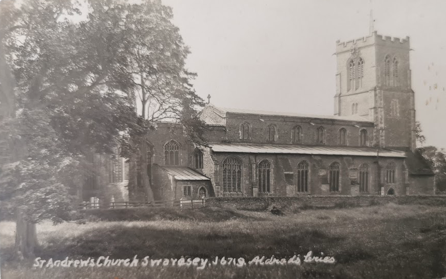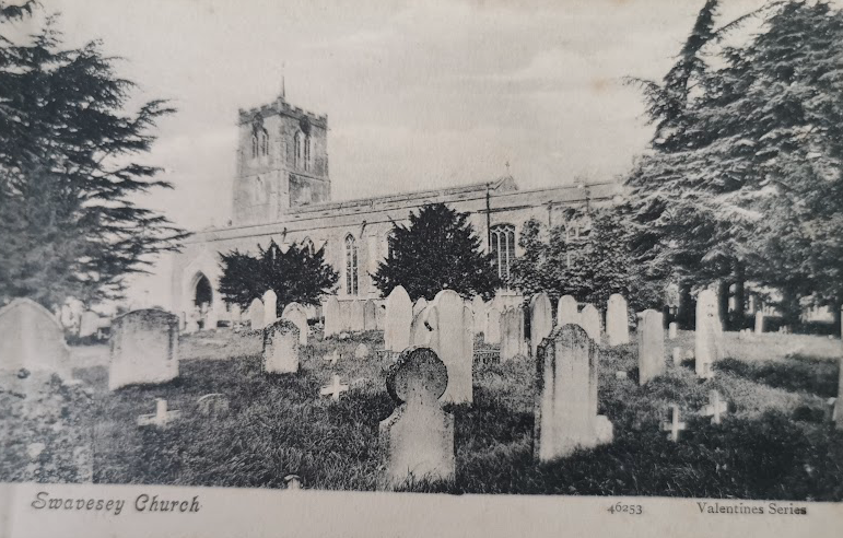 Swavesey Church, 1902 (Alan Lee Swavesey collection) Parish church; C11 and C12 wall fragments and quoins of nave and chancel of original Benedictine priory church; tower and North aisle C13, South aisle rebuilt and chantry chapel and South porch c.1300; chancel extended to full length of chapel and alterations to aisle windows early C14. Nave arcade, clerestory and roofs mid to late C15 with window tracery inserted into some original openings. Restorations C17, early C19, and 1865 by W.M. Fawcett, masonry said to have been used from priory ruins.