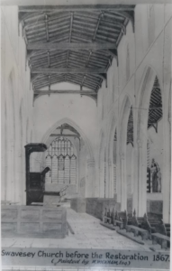 Swavesey Church 1866-7, before restoration fund by Mrs Dudley Ryder, daughter of Thomas Cockaigne. Lost Monument of Nicholas Stone on right. (Alan Lee Swavesey collection)