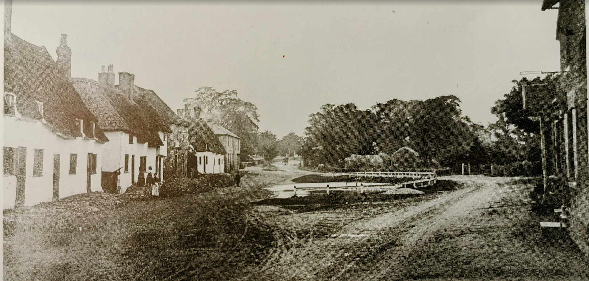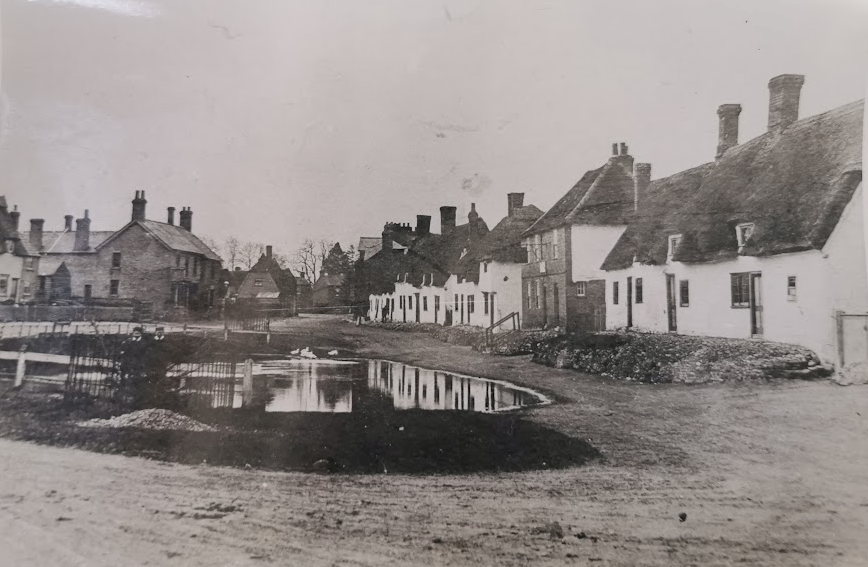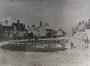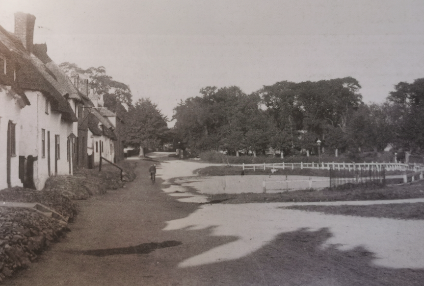 Church Green between the World wars. On left, Les Coles house, originally Golden Lion. Then the Frere cottages built after 1913 fire. (Alan Lee Swavesey collection)