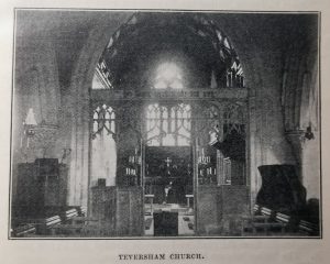 All Saints TevershamParish church, C13 but re-fenestrated and re-roofed in C14. In early C15 the West tower was inserted into the West end of the nave. The church was extensively restored and again re-roofed in 1863.