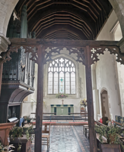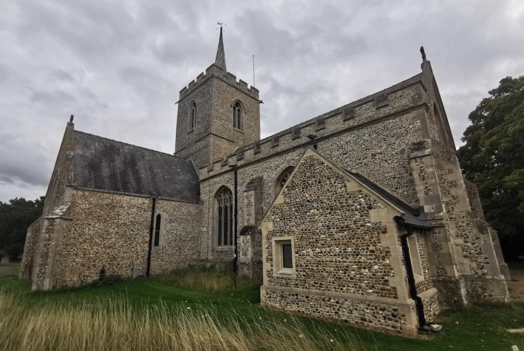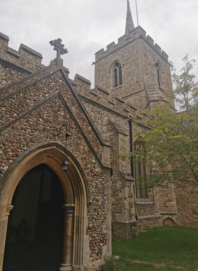 St George, Thriplow (RGL 2022)Parish Church. Some reused C12 material; central tower, north and south transepts and chancel C13. Nave C15. South porch in 1742 (Cole) rebuilt with vestry in C19. Restoration by Sir Gilbert Scott in 1876.