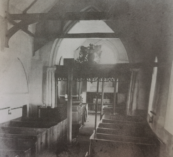 The photo shows the interior of the church before restoration in 1898. The church was reopened in 1900. (Vanishing Cambridgeshire, p.183)