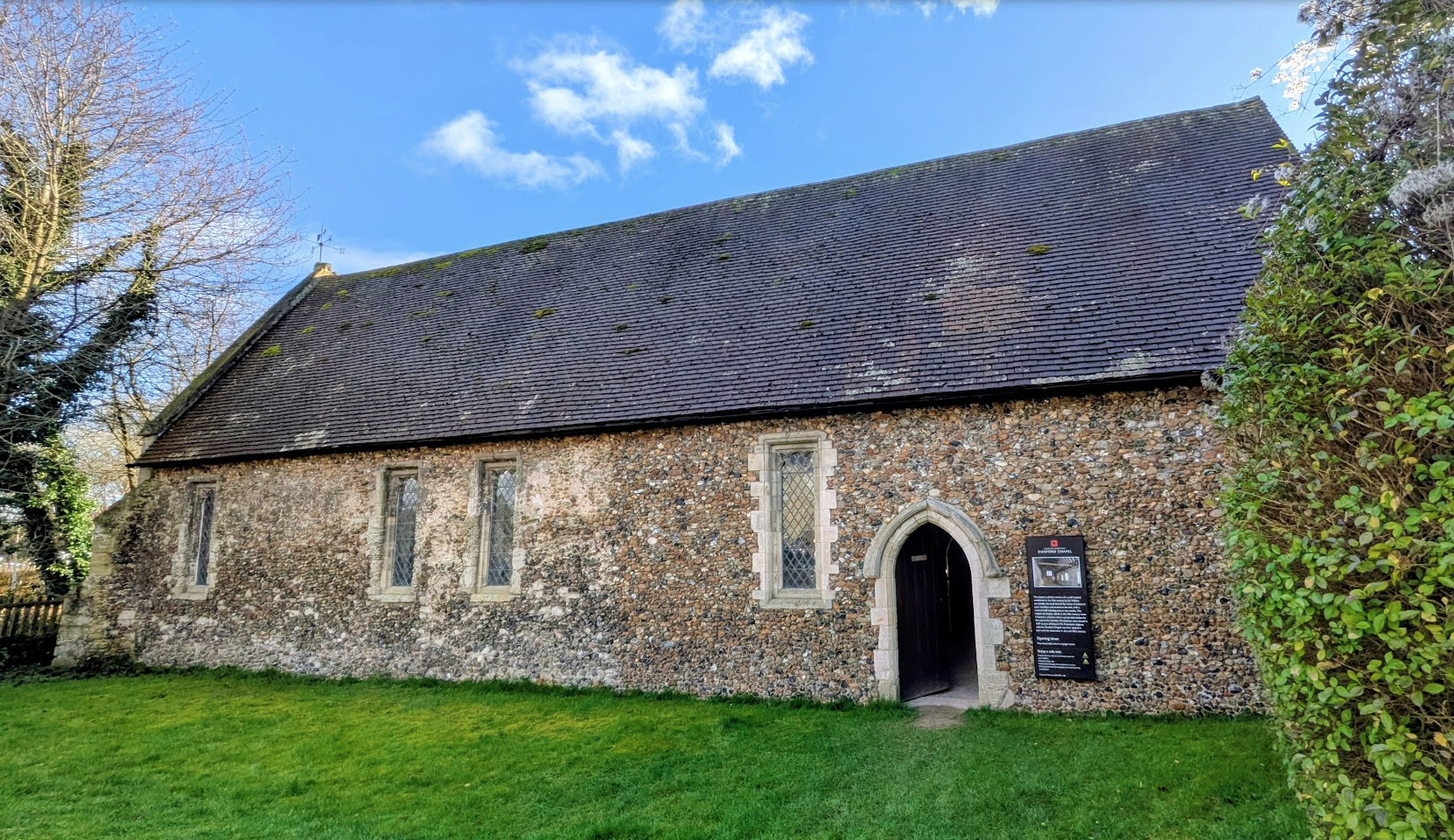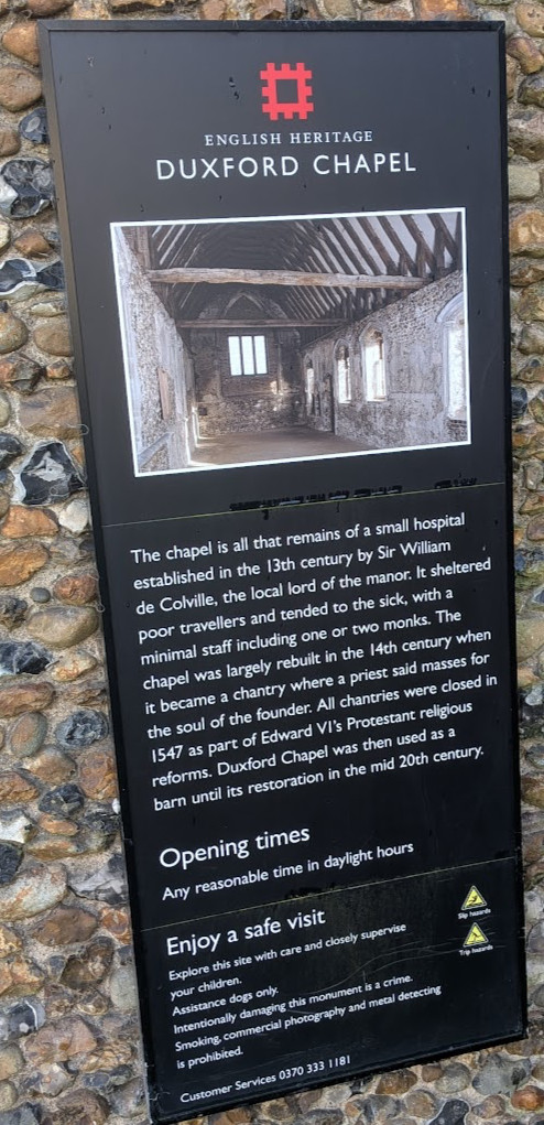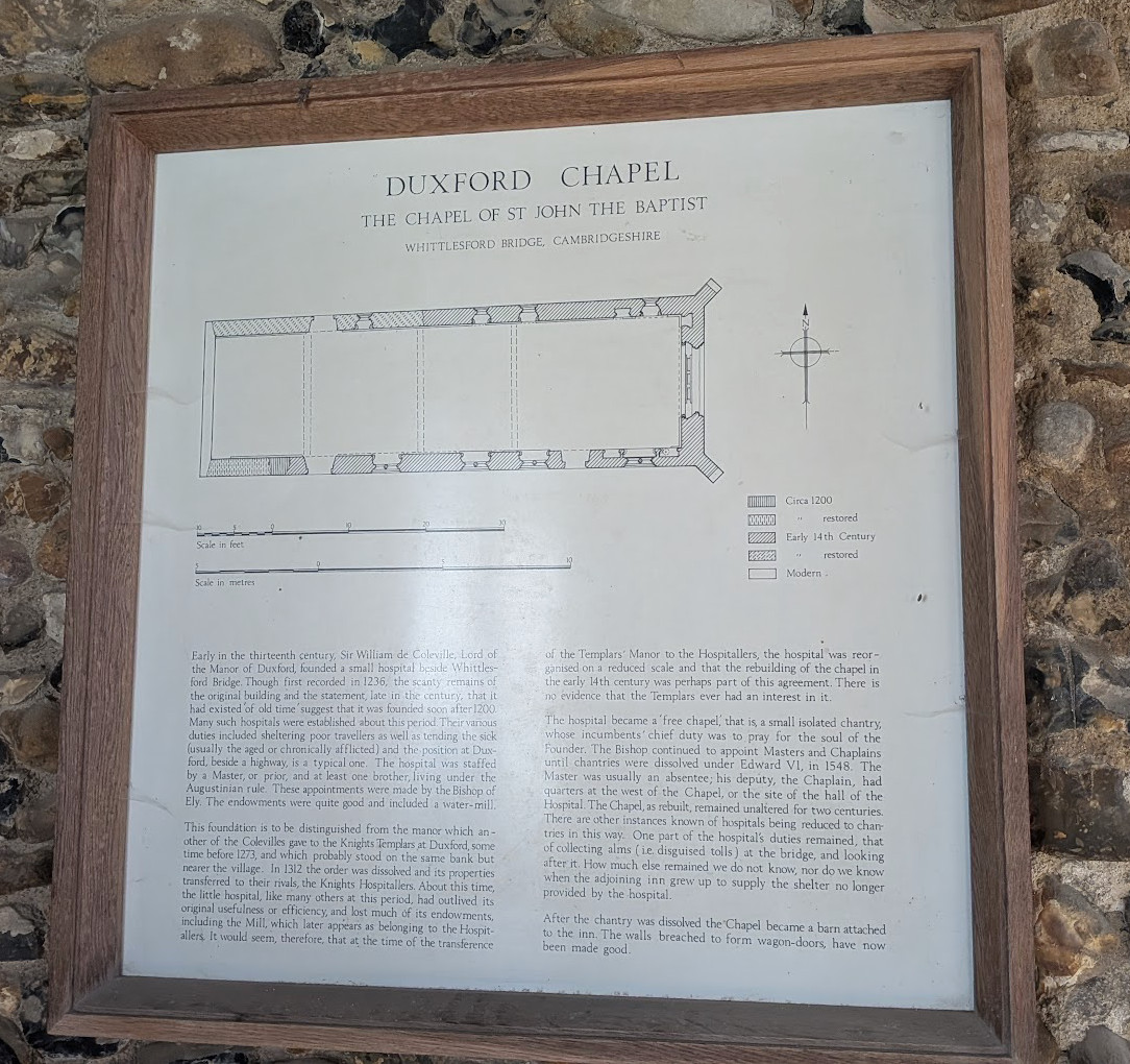 W M Palmer (1924) explains that the bridge here was once at the border of East Anglia and Mercia. He also adds that a hermit used to live at the chapel whose role was to help travellers to cross the ford. The vicar of Hinxton used to take a service at the chapel once a year and the hermit had to provide him with a suitable dinner.