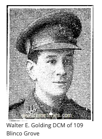 No. 109: Water Eric L Golding, joined Royal Horse Artillery and became lieutenant in 1st Btn Middlesex Regiment. Awarded DCM, he was killed 15/7/1916. The 14th – 17th July saw his battalion, ‘The Die Hards’, in the Battle of Bazentin Ridge; losses were very heavy