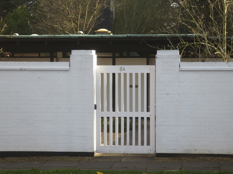 A delightful single-storey house of 1960-1 by the Danish architect Erik Sorenson, for Olga Kennard and her husband. Like so many bespoke post-war houses it has a defensive aspect to the street. A standard module determines the plan, which with the use of slende dark-brown timbering gives a fortuitously Japanese effect. The living room lies between an inner turfed courtyard and the more spacious back garden. Entrance wing and living-room wing are connected by bedrooms and a book-lined gallery.