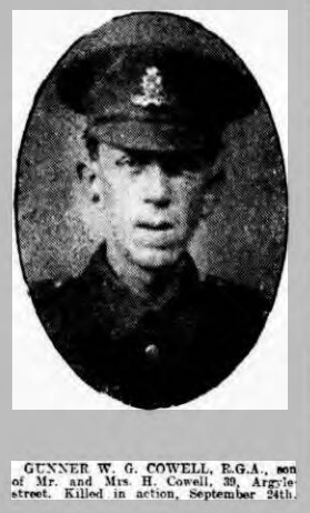Gunner W G Cowell E.G.A. killed in action 24th Sept. 1918.