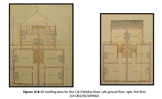 1 & 3 Madras RoadNos 1 & 3: in June 1892 an indenture was drawn up between Albert Edward Mason and Frederick Stephen Cottage. It can be assumed that this entailed the passing of the undeveloped plot from the former to the latter, as in September 1893 J. J. Cottage (of Brandon Hall, Norfolk) submitted an application to the Borough for approval to erect two “private dwelling houses”. Mr Cottage’s agent was R. Reynolds Rowe of Park House, Parkside.