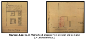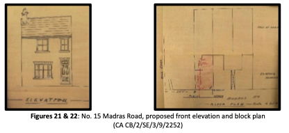 15 & 17 Madras RoadNo. 15: application in July 1904 by Alexander Marriott, of 47 Malta Road, to erect one cottage. It appears that Marriott was active in the development of several houses in Madras Road. Having his address in nearby Malta Road, he had the opportunity to keep his eye on what was going on. The house was auctioned in 1906. (Madras Road Report)