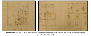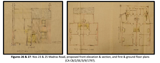 23 & 25 Madras RoadNos 23 & 25: in April 1901 an application to the Borough to build two houses was submitted by R. Bausor, architect of 46 Mawson Road, acting for George Willis of 198 Mill Road. According to Spalding’s street directories, both No. 23 and 25 were rented out by around 1902/03.