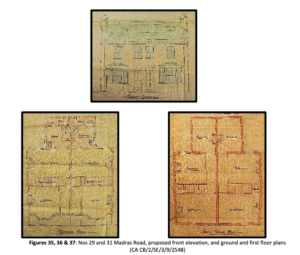 29 & 31 Madras RoadNos 29 & 31: application in December 1906 by Francis John Ingpen Cornwell, 14 Hope Street, to erect two cottages. Both houses subsequently rented out.