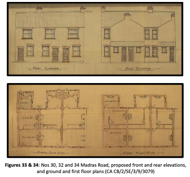 Nos 30, 32 & 34: in January 1901 Sarah Elizabeth Bull, of 29 Eden Street, Cambridge, applied for approval to erect three cottages. She also no agent.