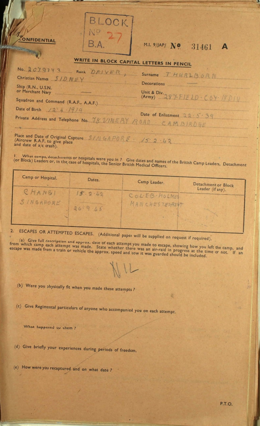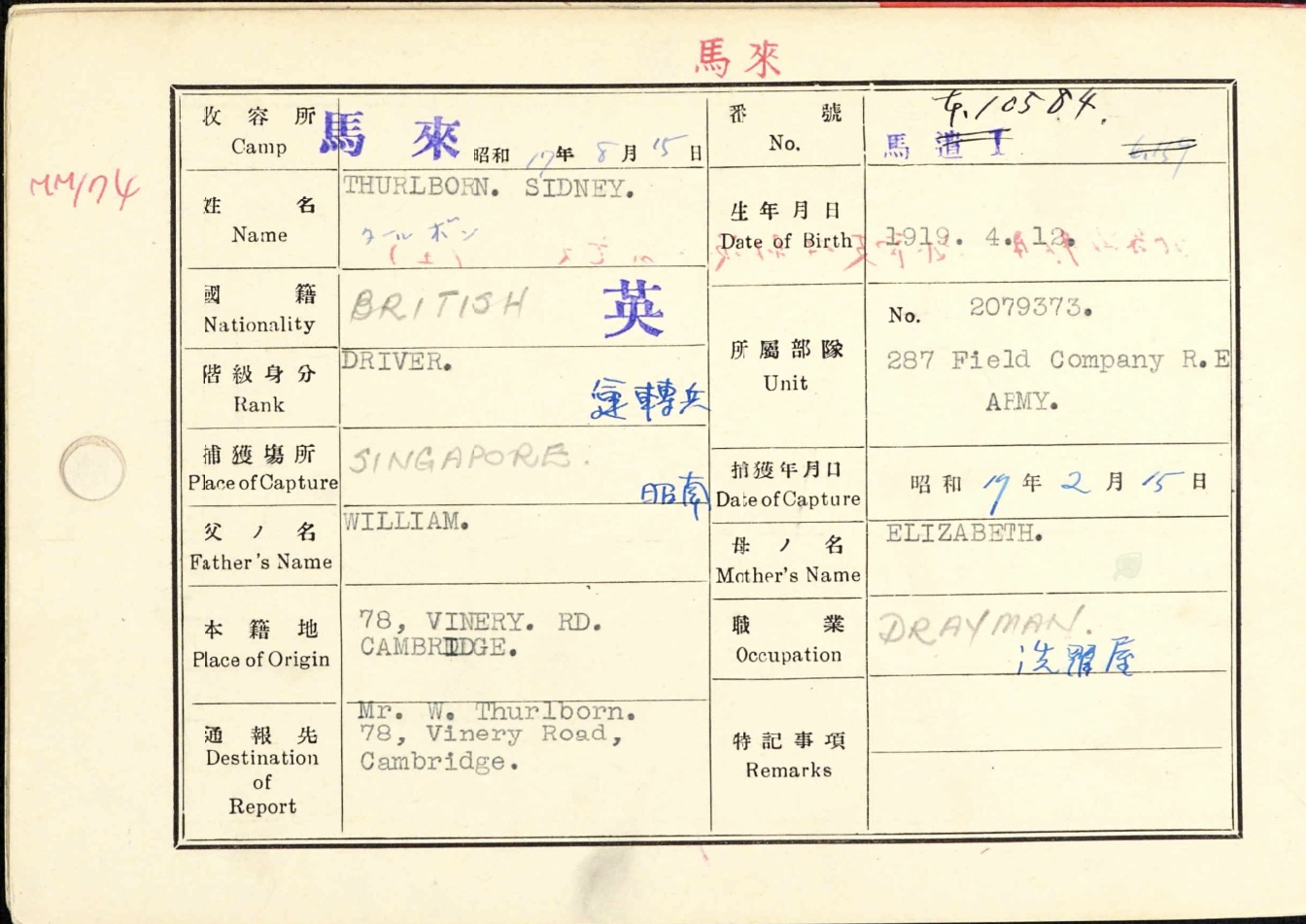 Sidney Thurlborn was born in 1919. In 1921 he was living at 111 Vinery Road. He enlisted in 1939. He was imprisoned in Changi, Singapore.