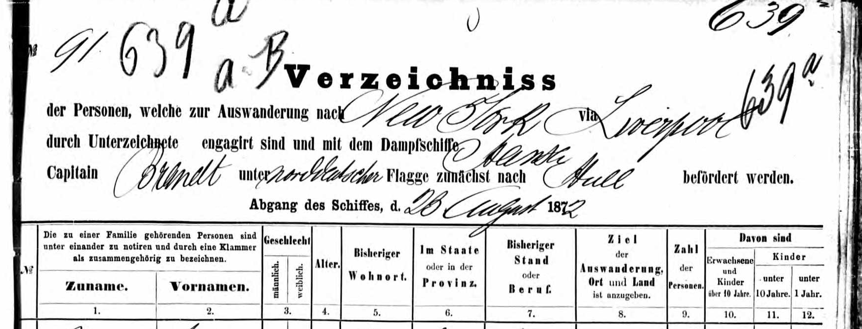 Header of passenger list of steamship Hansa, 23 August 1872, bound for New York via Liverpool and Hull. Source: Hamburg Passenger Lists, 1850-1934