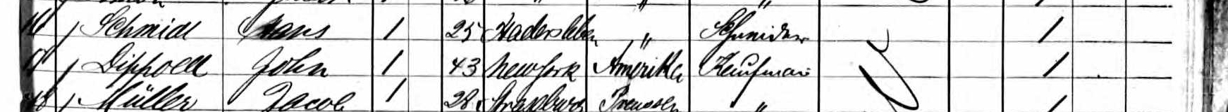 The name John Dippold (John rather than Johan, Johannes or Hans) appears on a passenger list of 23 August 1872, for a steamship setting out from Hamburg to New York with its first stop in Hull. His age is given as 43 and his occupation as ‘Kaufmann’ (merchant), and he had been living in New York.