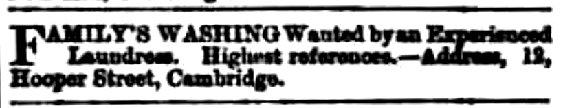 There is no entry for 12 Hooper Street in the 1891 Census, suggesting that Hannah was away for work. Later that year she was clearly back home, running her business and advertising in the local newspapers (Cambridge Chronicle, 30 October 1891):