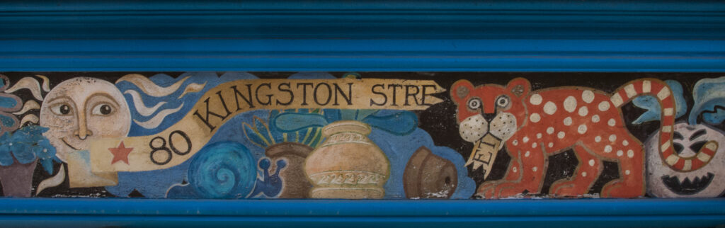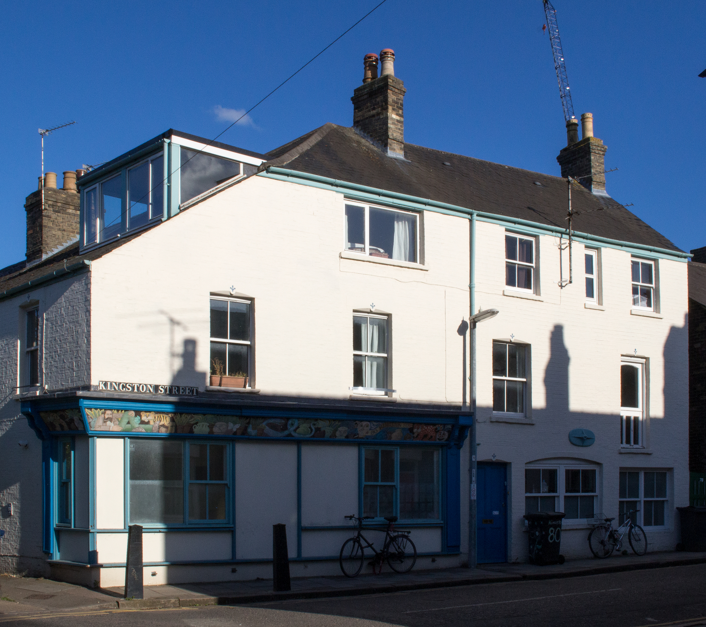 The mural on the shop’s fascia was painted around 1980 by artist Bryan Sentance, who now lives and works in Devon. At that time the shop was the headquarters of Cambridge Anti-Nuclear Campaign. It is now a housing co-operative.