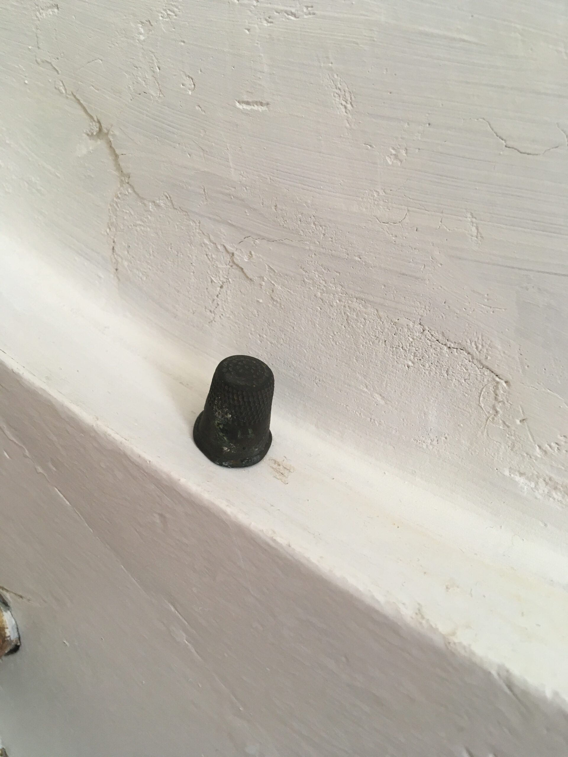During house renovations, the present owners found this thimble in a hole in the wall at the bottom of the stairs. (click to enlarge)
