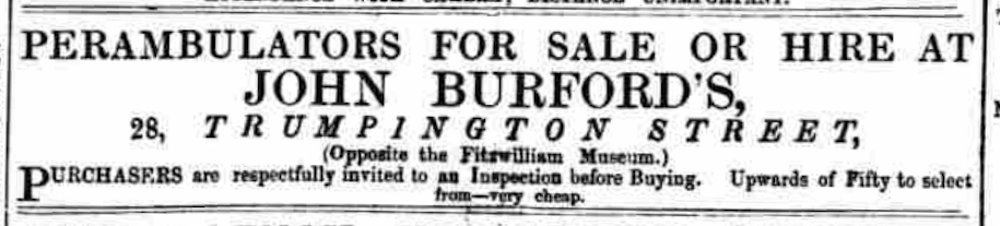 John Burford was born in 1829 in Westwell, Kent, the son of an agricultural labourer. By 1861 he was living in Cambridge with his wife Esther and young daughter Clara, working as a coach body maker. By 1869, according to the Post Office Directory for Cambridgeshire, he was running a ‘toy and fancy repository’ at 28 Trumpington Street, Cambridge. The shop also sold prams, making use of his background in coach building.