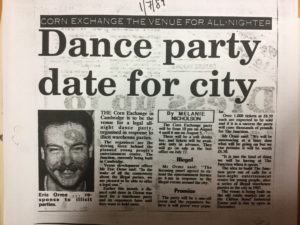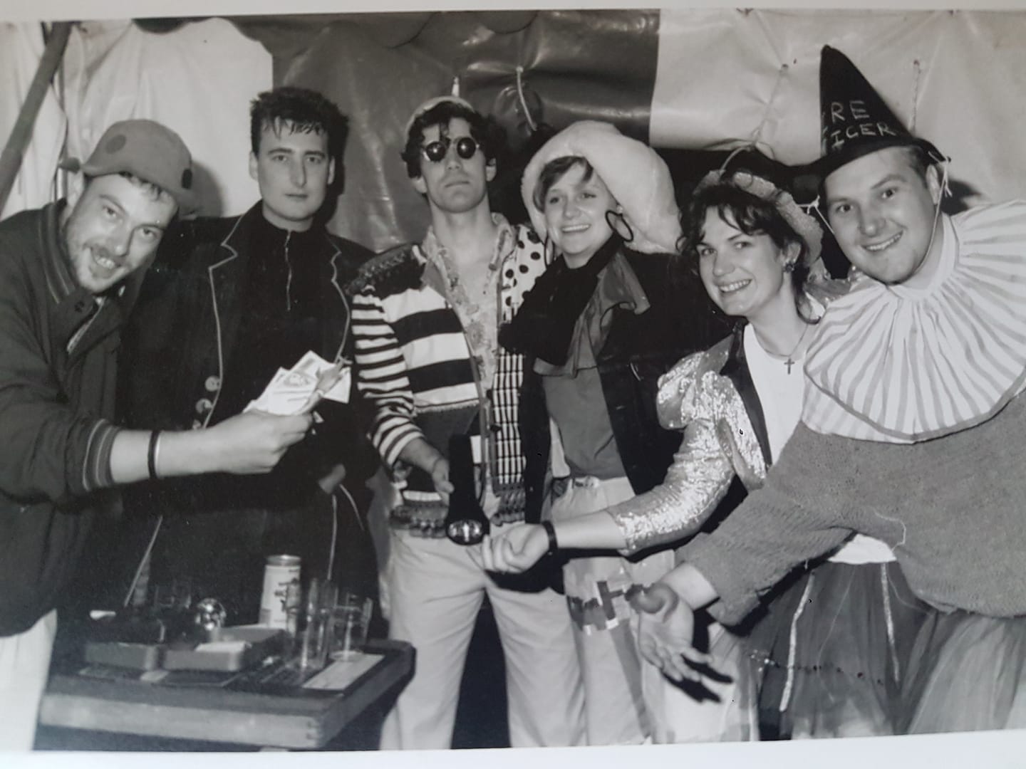 Jem Linsey remembers: This is CVG members on the door of an event, I think one of the ‘legal raves’ in the Guildhall. Eric had acquired some carnival costumes for some other event and so we made use of them for this one!